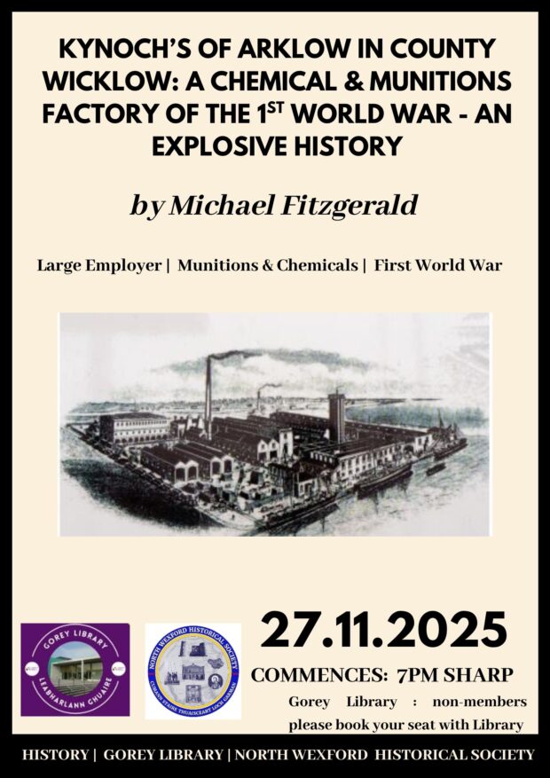 Our next talk lecture will be held in Gorey Library on 27th November 2025. Our talk will be given by Michael Fitzgerald on “Kynoch’s of Arklow” – the munitions factory from 1895 to 1918. The talk is free of of charge to attend but non-members are asked to book with the Library directly.