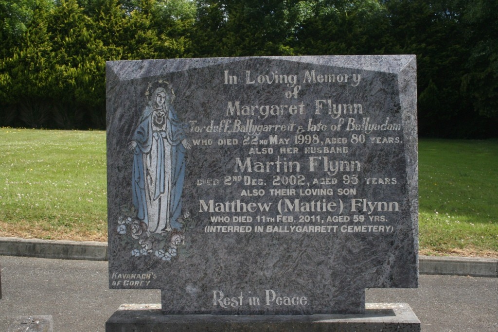 Also their loving son Matthew [ Mattie ] Flynn who died 11th Feb. 2011 aged 59 yrs. [ Interred in Ballygarrett cemetery].