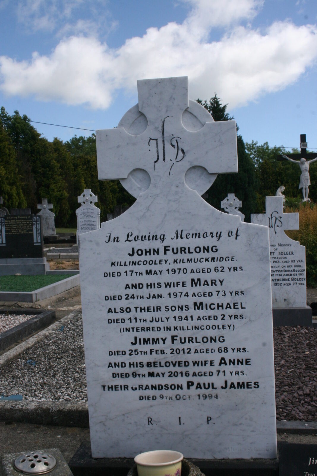In loving memory of John Furlong Killincooley , Kilmuckridge died 17th May 1970 aged 62 yrs.